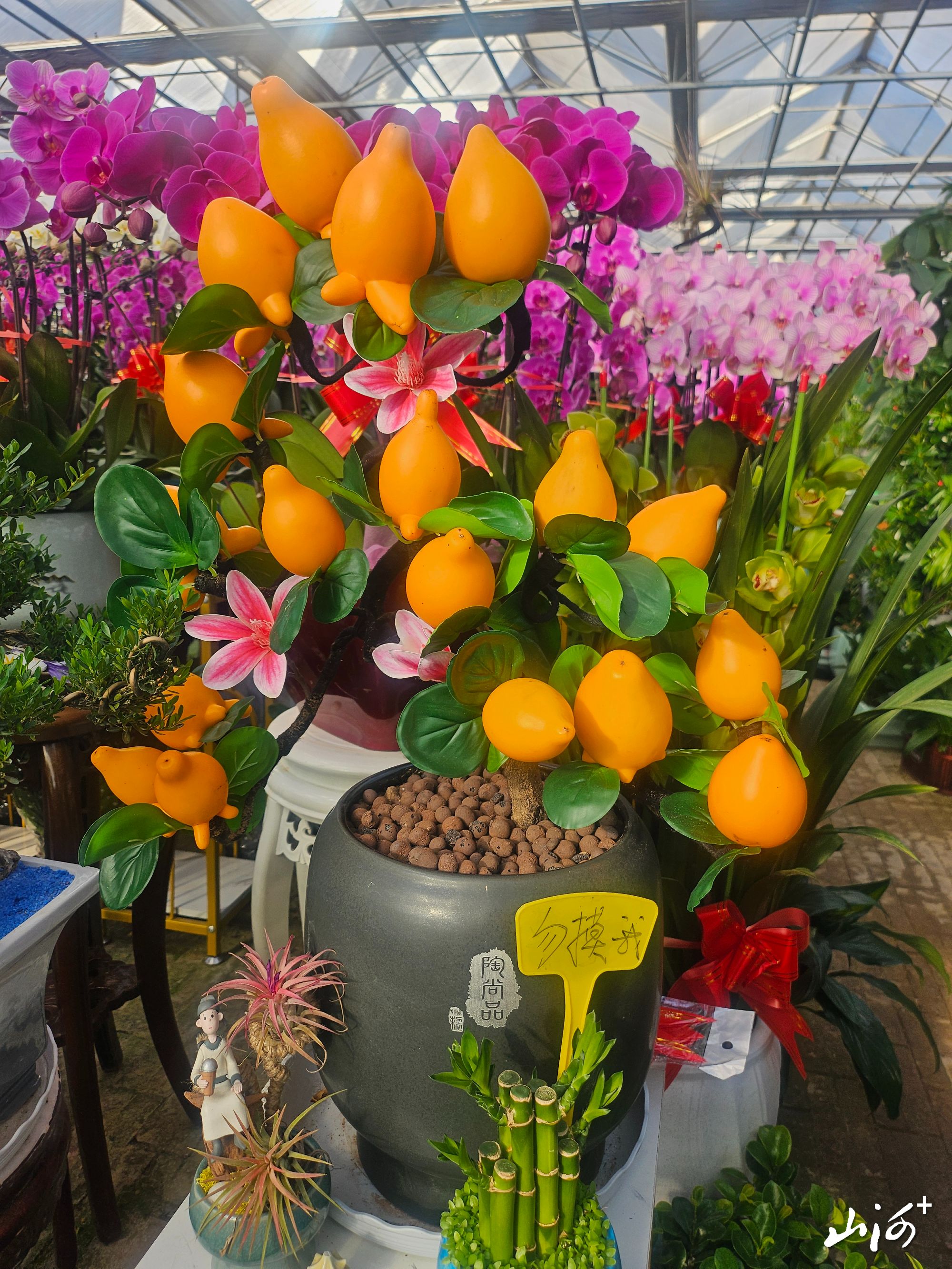 周末,走进太原市杨家峪花卉市场,浓郁的绿意与清新的果香扑面而来,果实绿植专区早已是人头攒动。一排排矮化金橘盆栽整齐陈列,金黄的果实像一串串迷你金元宝挂满枝头,叶片翠绿鲜亮,部分商户还贴心地在枝丫上点缀了小红灯笼和“吉祥如意”的祝福便笺,节日氛围十足,引得顾客纷纷驻足拍照询价。