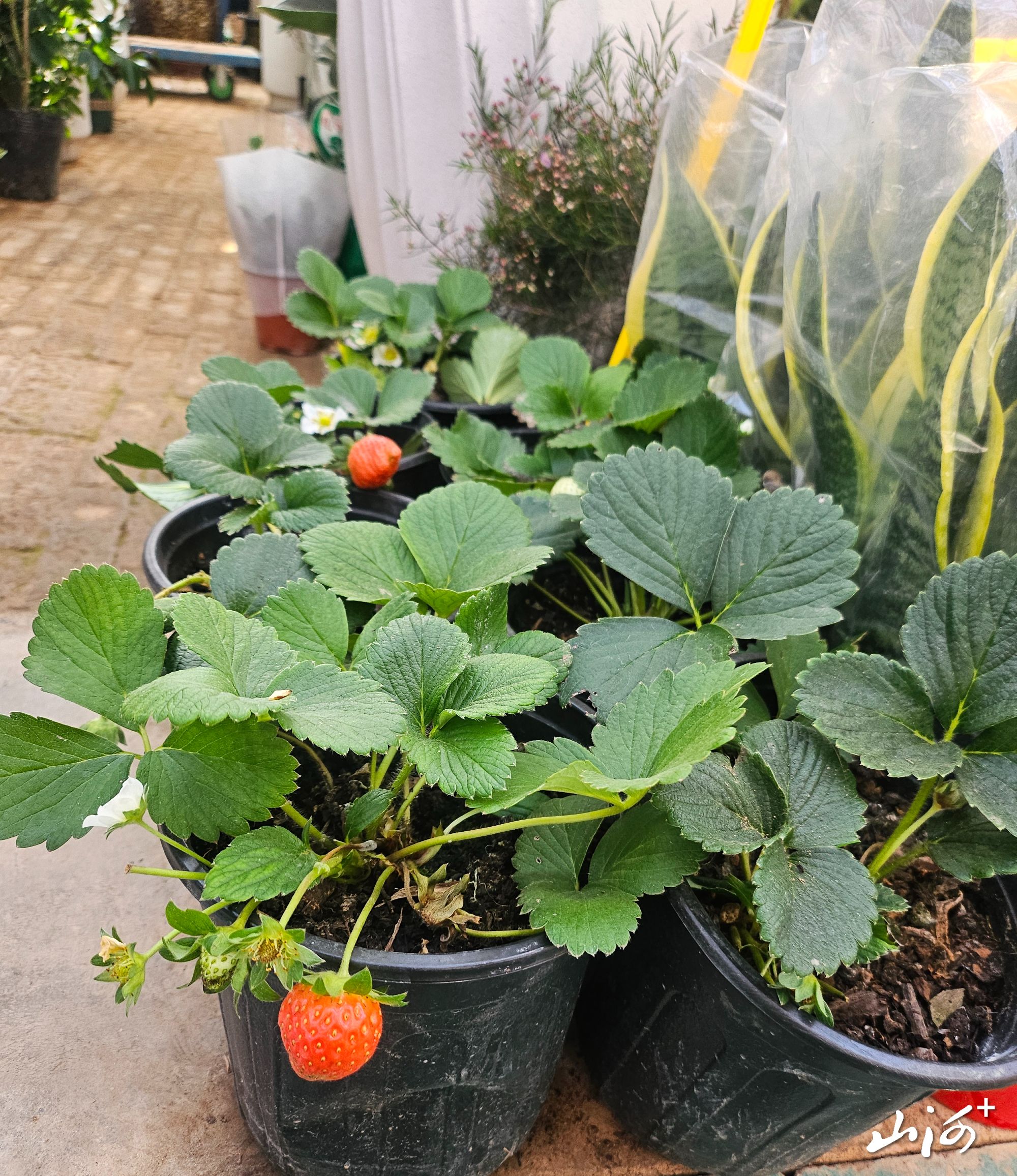 在市场深处的另一家摊位前,草莓盆栽更是聚集了不少人气,成为亲子家庭的“心头好”。嫩绿的匍匐茎沿着花盆边缘自然垂落,叶片间点缀着纯白的小花,鲜红的果实像一颗颗心形玛瑙,饱满多汁的模样让人垂涎欲滴。小朋友踮着脚尖,好奇地打量着这些挂在枝头的草莓,时不时伸手轻触着毛茸茸的果面,眼神里满是欢喜。“这种草莓盆栽既能观赏又能食用,孩子每天都要凑过去看看果实有没有长大,还能让他了解植物生长的过程,特别有意义。”市民张先生一边挑选一边告诉记者,他现在是第三次来买果实绿植了,之前买的蓝莓盆栽不仅结了果,还净化了室内空气。商户老板介绍,草莓盆栽价格从30元到80元不等,因为兼具趣味性和实用性,最近销量比平日上涨了50%,很多家长带着孩子来挑选,体验亲手种植、采摘的乐趣。