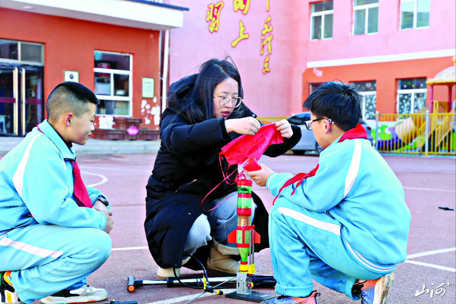 临县黄白塔寄宿制小学航模社团学生在老师的指导下进行水火箭实验。