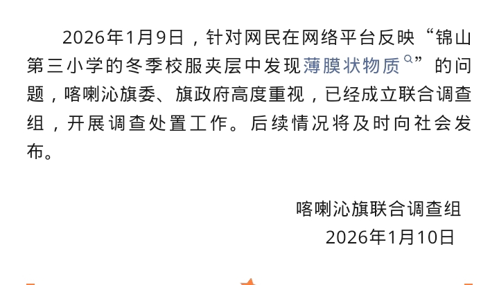 山西晚报·山河+讯 近日,内蒙古赤峰市喀喇沁旗锦山第三小学的冬季校服被家长曝出夹层中藏有“塑料薄膜”,引发社会广泛关注。官方通报1月10日发布,宣布成立由多部门组成的联合调查组,全面开展调查处置工作。