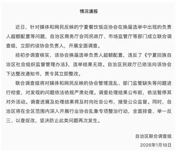 1月18日,宁夏回族自治区联合调查组发布通告:针对媒体和网民反映的宁夏餐饮饭店协会在换届选举中出现的负责人超额配置等问题,自治区商务厅会同民政厅、市场监管厅等部门成立联合调查组,立即约谈协会负责人,开展全面调查。经初步调查核实,该协会换届选举负责人超额配置,违反了《宁夏回族自治区社会组织监督管理办法》,选举结果无效。自治区民政厅已依法向该协会下达整改通知书,责令其立即整改。联合调查组将对媒体和网民反映的协会管理混乱、部门监管缺失等问题进行彻查,对发现的问题依法依规严肃处理。调查处理结果公布前,依法暂停其对外活动。调查进展及处理结果将及时向社会公布,接受公众监督。同时,自治区将在全区范围内深入开展行业协会乱象专项整治行动,全面排查、举一反三、以查促改,坚决防止此类问题再次发生。
