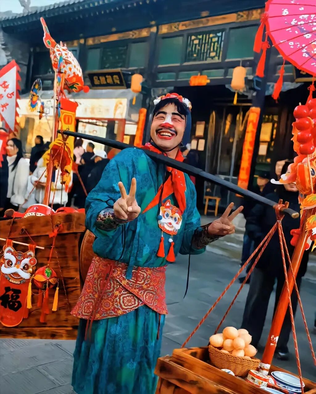 杨翔说,元旦那会儿的卖货郎扮的是三花脸的妆,白鼻子、红脸蛋,是传统戏曲里丑角的路子。这回过年再来,他自己琢磨着改了改,把眉毛描得浓黑上扬,胡须画成两撇俏皮的“八”字,配上师傅缝的那顶虎头帽,眉眼间尽是亲和劲儿。