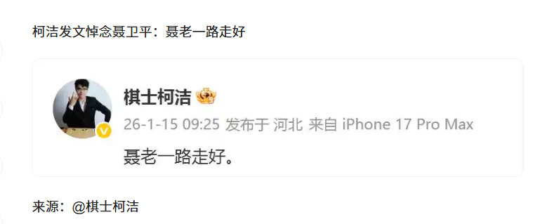 1月15日,柯洁在社交平台转发了聂卫平逝世的讣闻,并写道:“聂老一路走好。”