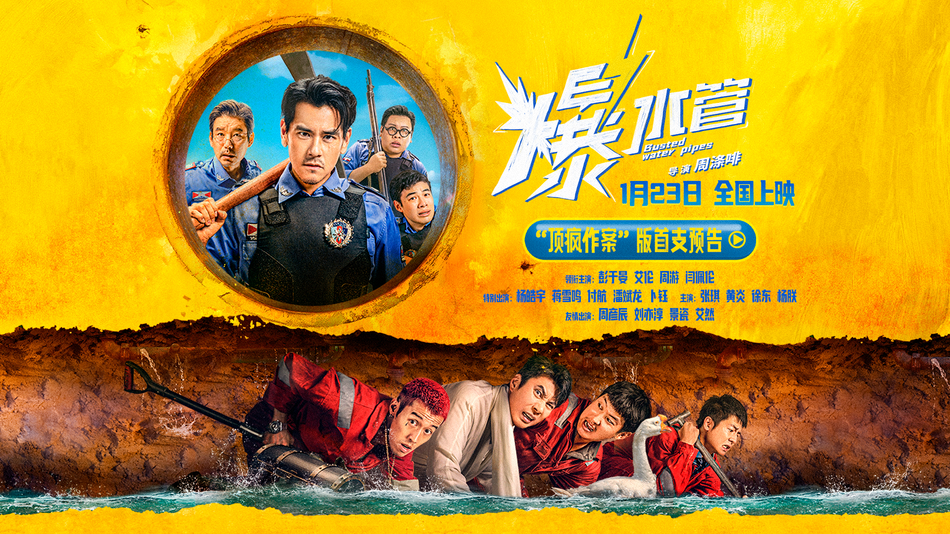 犯罪喜剧电影《爆水管》由周涤啡执导,彭于晏、艾伦、周游、闫佩伦领衔主演,杨皓宇、蒋雪鸣、付航、潘斌龙、卜钰特别出演,张琪、黄炎、徐东、杨朕主演,周彦辰、刘亦淳、景瓷、艾然友情出演,由上海淘票票影视文化有限公司、含章贞成(北京)文化传播有限公司、上海腾飞影业传媒集团有限公司、海南奥陶纪影业有限公司、象山栩多木影视文化有限公司出品,由成都市电影集团有限责任公司、江西慈文影视文化传媒有限公司、北京幕间映画娱乐有限公司、北京大晟数娱科技有限公司、北京初之影业有限公司联合出品,将于1月23日全国上映,敬请期待!