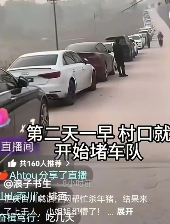 山西晚报·山河+记者注意到,截至1月12日中午,相关视频全网播放量超千万,#重庆女子求助杀猪千人响应#话题登上热搜。短短三天,“呆呆”个人账号涨粉逾56万,从1800粉丝跃升至56.3万。活动高峰期,超千名网友从重庆主城、江津、荣昌乃至四川等地驱车数百公里赶赴现场,村道车辆排队长达3公里,当地文旅、公安、交通等部门连夜协调,增派警力疏导交通、维持秩序。