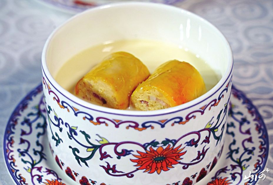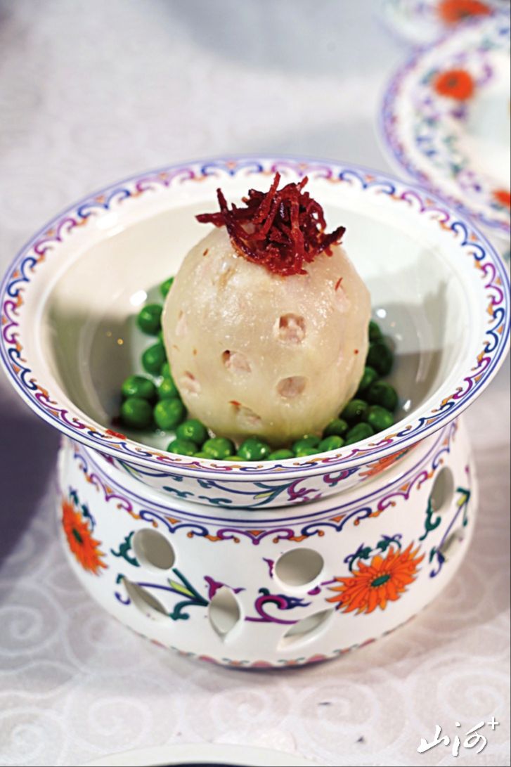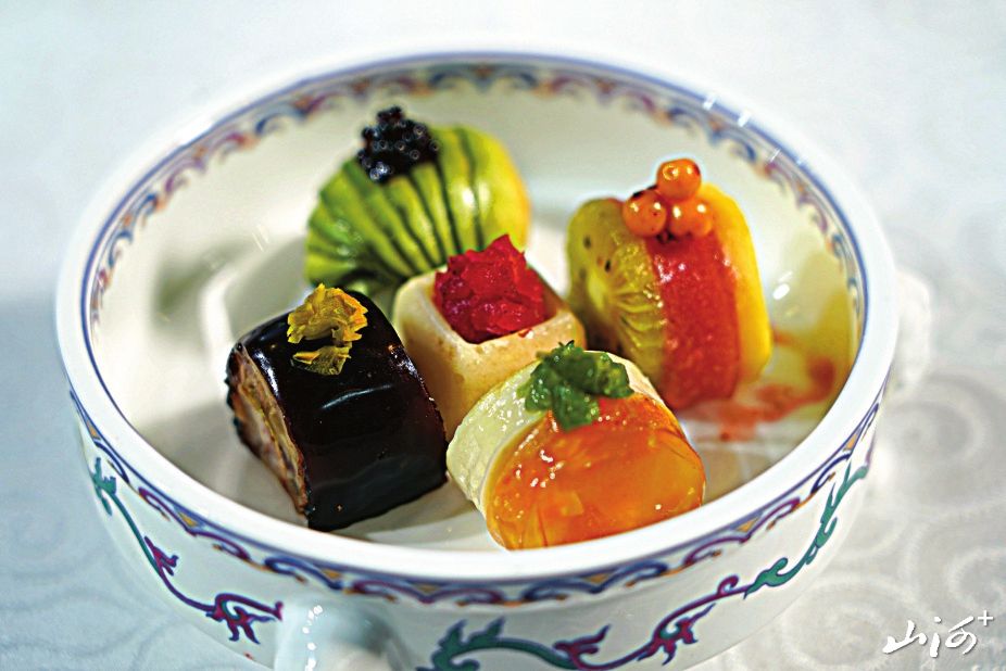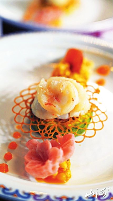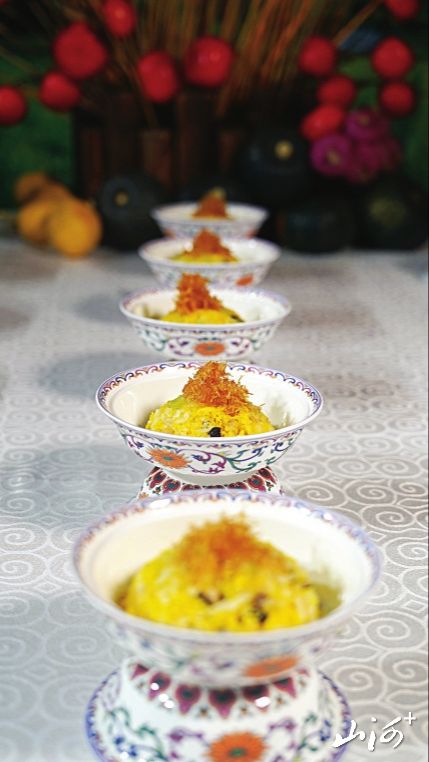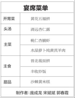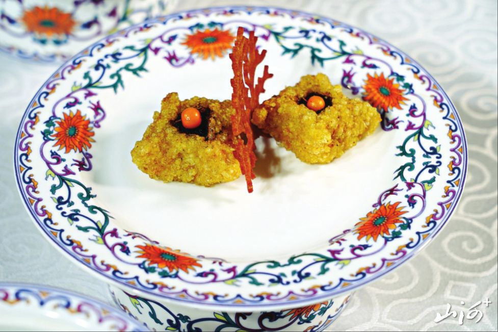 秋天的色彩是最为丰富,秋天的收获也是多样的,在这个成熟和收获的季节里,人们的心情也充满了甜蜜的味道。一款开胃菜在拼盘的造型和食材的色彩上几乎囊括了秋天所有能见到的颜色,主菜桃仁杏脯虾的色彩饱和度也非常高,让人看着就有好心情。另一款主菜摆脱了传统的羊肉菜品的造型,可谓别具一格。主食莜面虽然看着色彩单调,但是在造型上做了多样化处理,同样体现了一种繁盛感。此款宴席的食器选用了清宫粉彩瓷器,更加体现了这款宴席的气派和讲究。