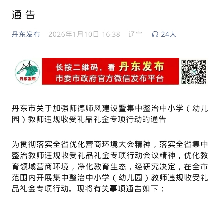 山西晚报·山河+讯 1月10日,据微信公众号“丹东发布”消息,丹东市教育局于1月9日正式发布《关于加强师德师风建设暨集中整治中小学(幼儿园)教师违规收受礼品礼金专项行动的通告》,宣布将在全市范围内开展为期一年的集中专项整治行动,重点整治教师违规收受礼品礼金等不正之风,全力营造风清气正的教育生态。
