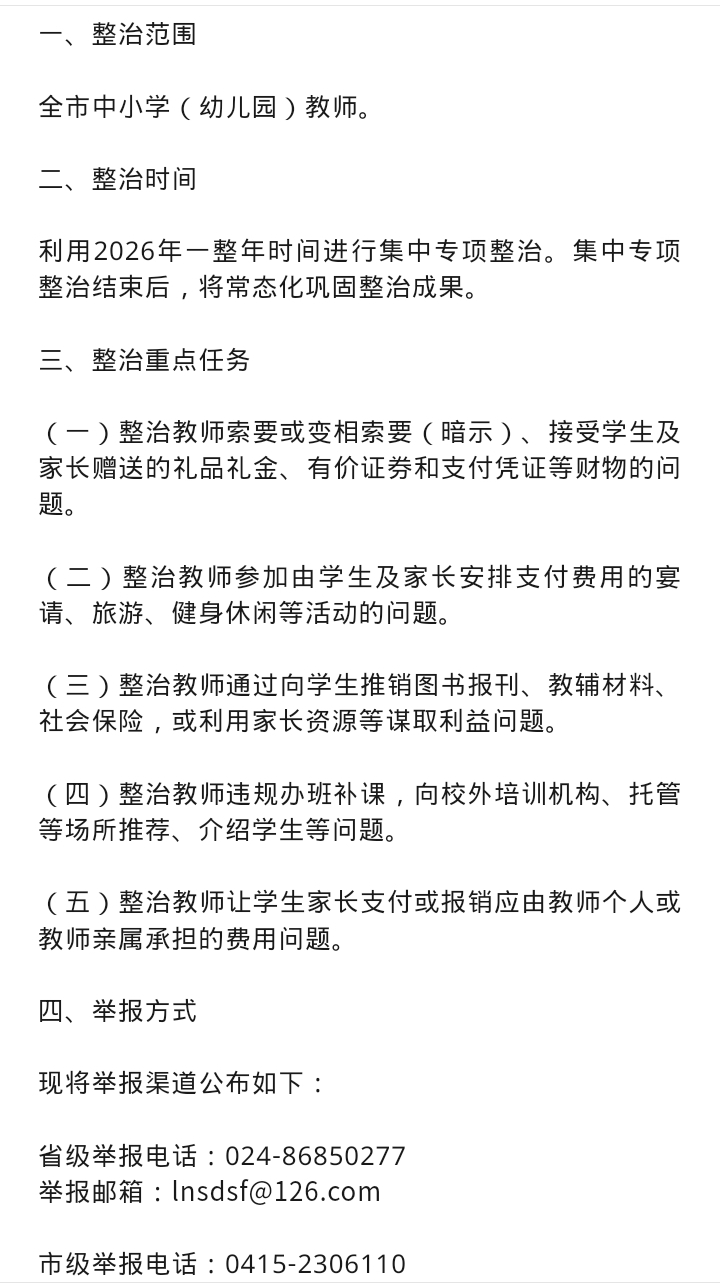 此次专项行动覆盖全市所有中小学及幼儿园在职教师,明确将2026年定为“师德师风专项整治年”。集中整治结束后,相关措施将转为常态化机制,持续巩固治理成效。