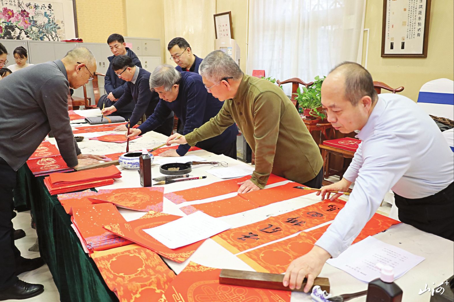 活动当天,还举办了宝贤堂法帖学术交流活动和“喜迎马年”省市书法家双塔博物馆书写春联活动。在学术交流活动中,来自山西省书法家协会、山西省三晋文化研究会、山西大学、山西师范大学的专家学者,山西省考古研究所、太原市文物系统的文物保护专家,书法爱好者、社会研究者等齐聚一堂,围绕宝贤堂拓本的版本渊源、艺术特色、地位影响及文化传承等展开深度对话,为后续的文物研究与保护工作注入新的思路与活力。书写春联活动中,双塔博物馆变身热闹的“文化集市”,省市书法家凝神聚气,笔走龙蛇,隶、楷、行、草等多种书体各显神韵,一副副笔力遒劲、寓意吉祥的春联应运而生。现场群众热情高涨,纷纷驻足等候,不时发出阵阵赞叹。