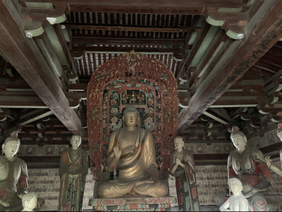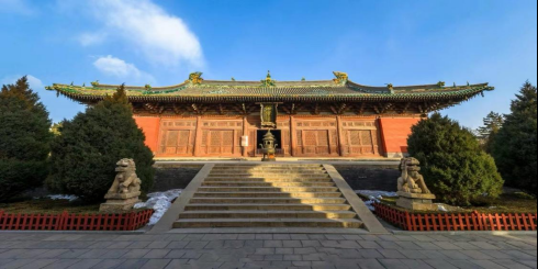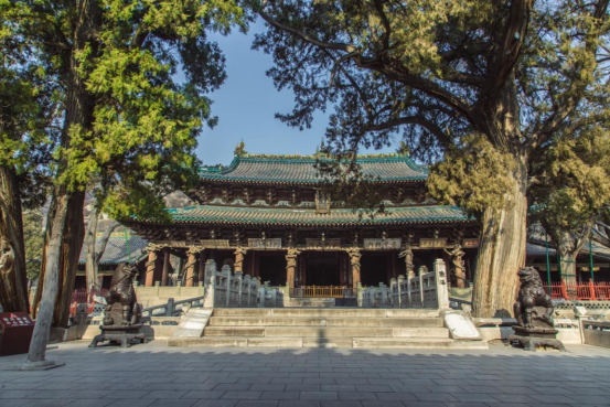 金代遗珍,21米雄殿冠绝中华。面阔七间,进深四间,建筑面积1840平方米,九脊歇山顶,是我国现存最大的金代单体建筑。琉璃脊饰、彩塑造像、大幅壁画、巨制匾额、雕花门窗均为金代原物,弥足珍贵,并称“崇福五绝”,享誉中外。