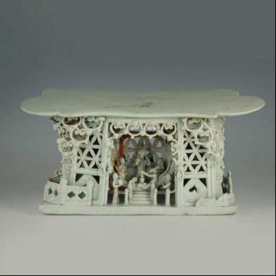 元代景德镇窑杰作,1973年大同出土。枕体呈宫殿造型,长32厘米、高15.3厘米,通体月白釉莹润如玉。四面透雕神话场景:正面广寒宫内嫦娥居中,玉兔捣药,四侍女恭立;背面官员审案,侍臣肃立;左右两侧辅以传说故事。玲珑剔透的菱形窗棂与悬垂云珠纹,展现元代陶瓷镂空技艺巅峰。