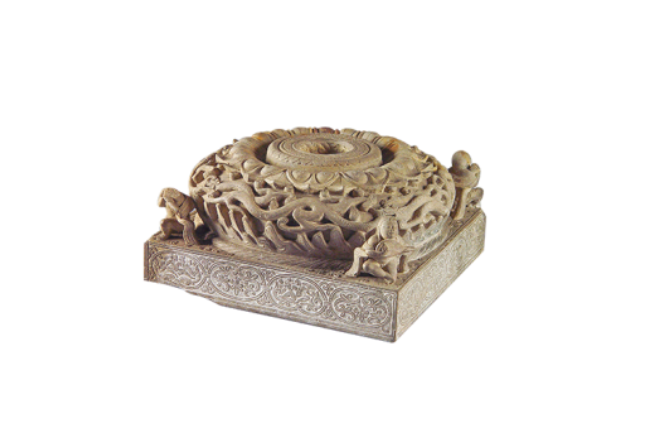 通体浮雕图案分四层精雕:顶部重瓣莲台,中部四龙穿云,基座四角胡人弹奏琵琶腰鼓,侧面心形卷草纹流动如生,尽显艺术融合。