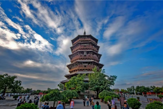 67.31米纯木结构蝉联世界最高木塔称号。54种斗栱无钉咬合承重,历经千年地震炮击屹立不倒。二层释迦像内藏佛牙舍利,塔上保存并悬挂辽金至民国时期的牌匾、楹联58件。