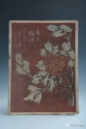 插屏,自铭“插镜”,为文房陈设用器。1915年平定知县赠巡按的廉政见证,正面红釉剔刻牡丹雍容,背面500字铭文记述清官治绩,开北方紫砂文人器先河。