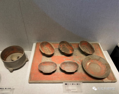 2003年马家坪汉墓出土,完整呈现汉代贵族宴饮制度。陶樽(盛酒温酒器)、陶勺(舀酒器)、耳杯(饮酒器)、陶盘陶案四件套,通体施朱红彩绘仿漆器纹饰。此组合证实汉代随葬明器“以陶代漆”的丧葬习俗,是研究汉代社会生活与工艺演变的重要实证。