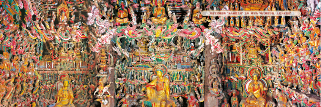 明代悬塑奇观。儒释道881尊仙佛共聚一殿,最小仅数厘米。楠木雕韦陀像铠甲纹路清晰,明万历原匾高悬门楣。