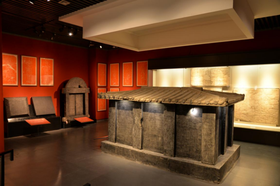 唐开元九年(721年)贵族葬具,万荣县皇甫乡出土。通高2.05米,面阔三间,由34块青石组成庑殿顶殿堂造型。底座12个壸门雕天马、瑞兽;10块壁板线刻宫女执扇、门吏守备;椁顶完整呈现唐代庑殿建筑结构,是盛唐石雕艺术与丧葬礼制的双重实证。