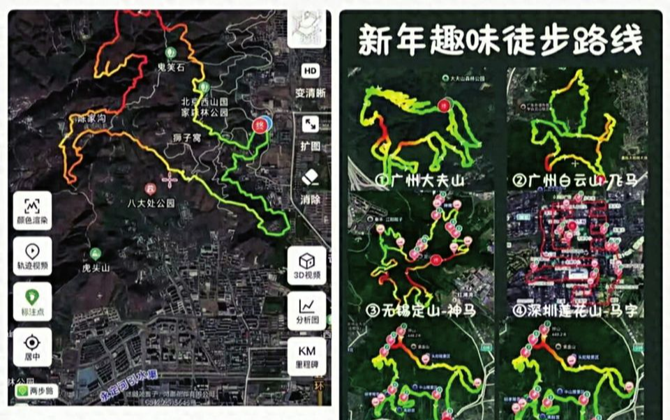 马年临近,一种名为“画马”的创意徒步玩法在社交平台走红。参与者按特定轨迹行走,使运动轨迹在地图上形成一匹马的图案。其中,广州大夫山森林公园内一条全长14.08公里、耗时近9小时的“画马”路线因挑战性强、地形险峻引发大量关注,截至1月16日轨迹下载量超3800次。