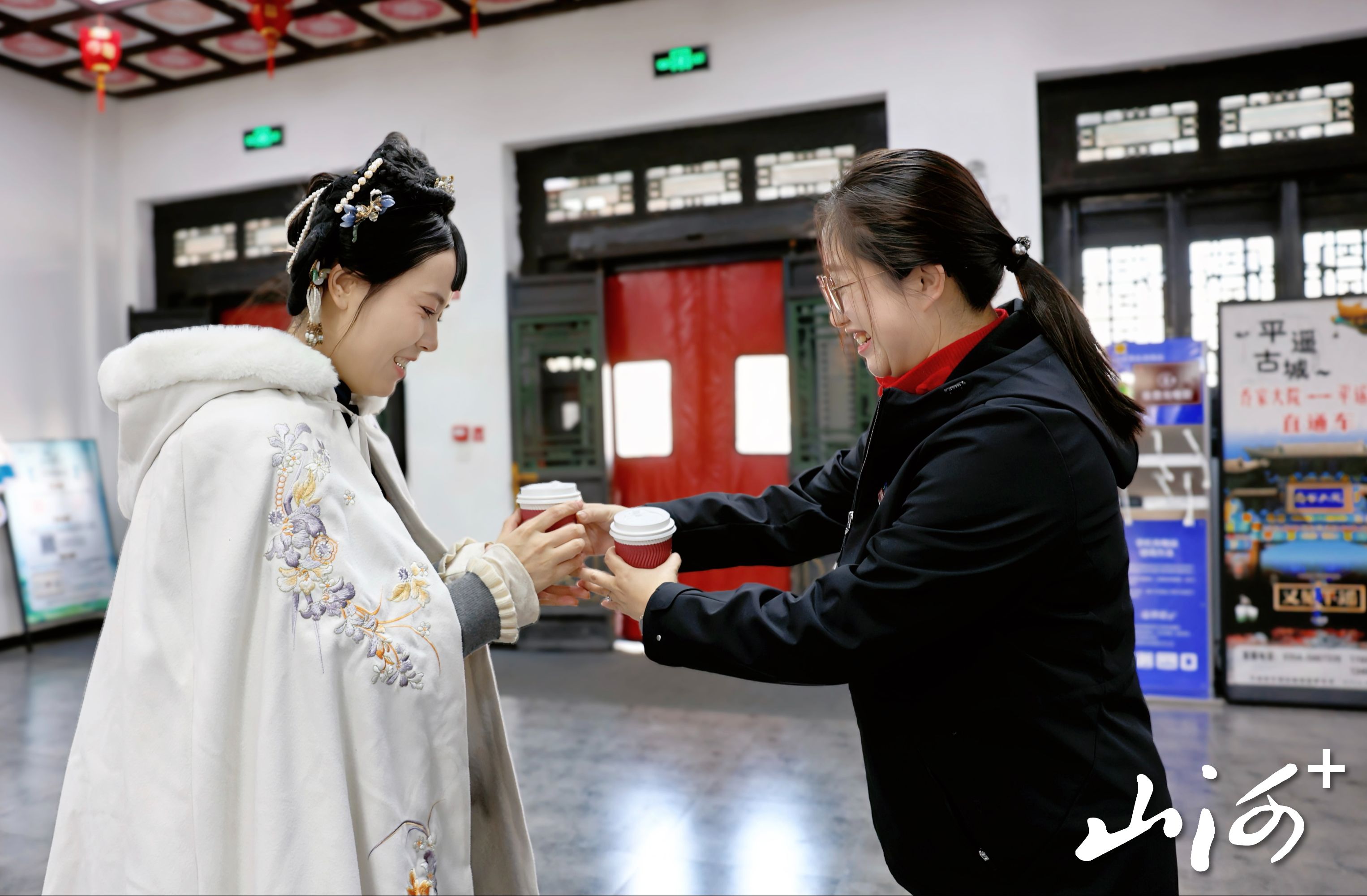戏台院与乔家花园内,传统表演全天候不间断呈现。祁太秧歌的质朴灵动、晋剧的婉转悠扬、民歌的醇厚深情及晋剧曲牌联奏的激昂铿锵轮番登台,为游客奉上一场精彩绝伦的文化盛宴。景区更贴心准备了暖心姜茶,让游客在观赏表演的间隙驱寒暖心,现场处处暖意融融,尽显人文关怀。