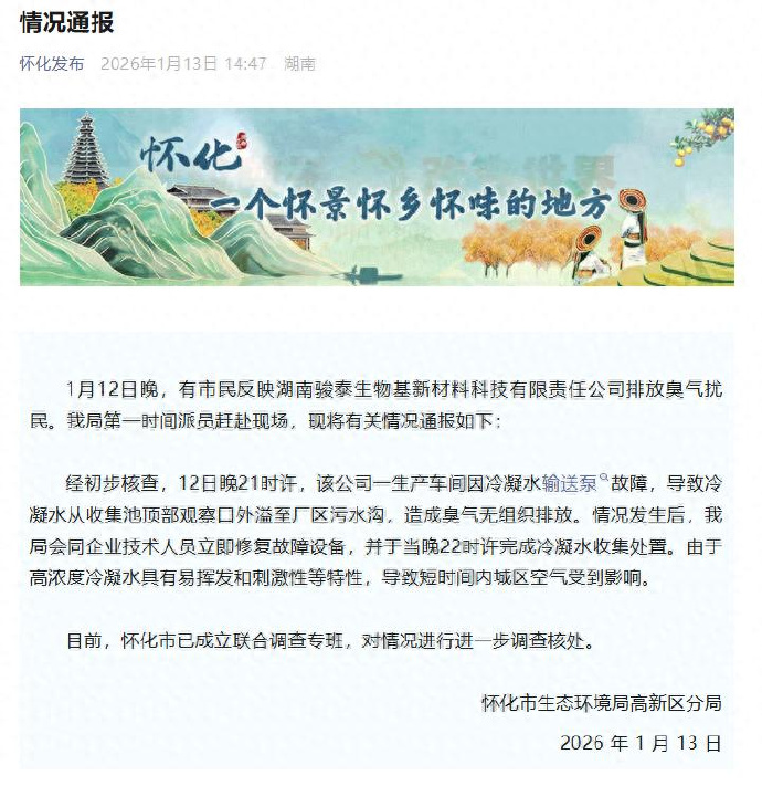 1月13日,据怀化发布,怀化市生态环境局高新区分局发布情况通报。据通报,1月12日晚,有市民反映湖南骏泰生物基新材料科技有限责任公司排放臭气扰民。经初步核查,12日晚9时许,该公司一生产车间因冷凝水输送泵故障,导致冷凝水从收集池顶部观察口外溢至厂区污水沟,造成臭气无组织排放。情况发生后,我局会同企业技术人员立即修复故障设备,并于当晚22时许完成冷凝水收集处置。由于高浓度冷凝水具有易挥发和刺激性等特性,导致短时间内城区空气受到影响。目前,怀化市已成立联合调查专班,对情况进行进一步调查核处。