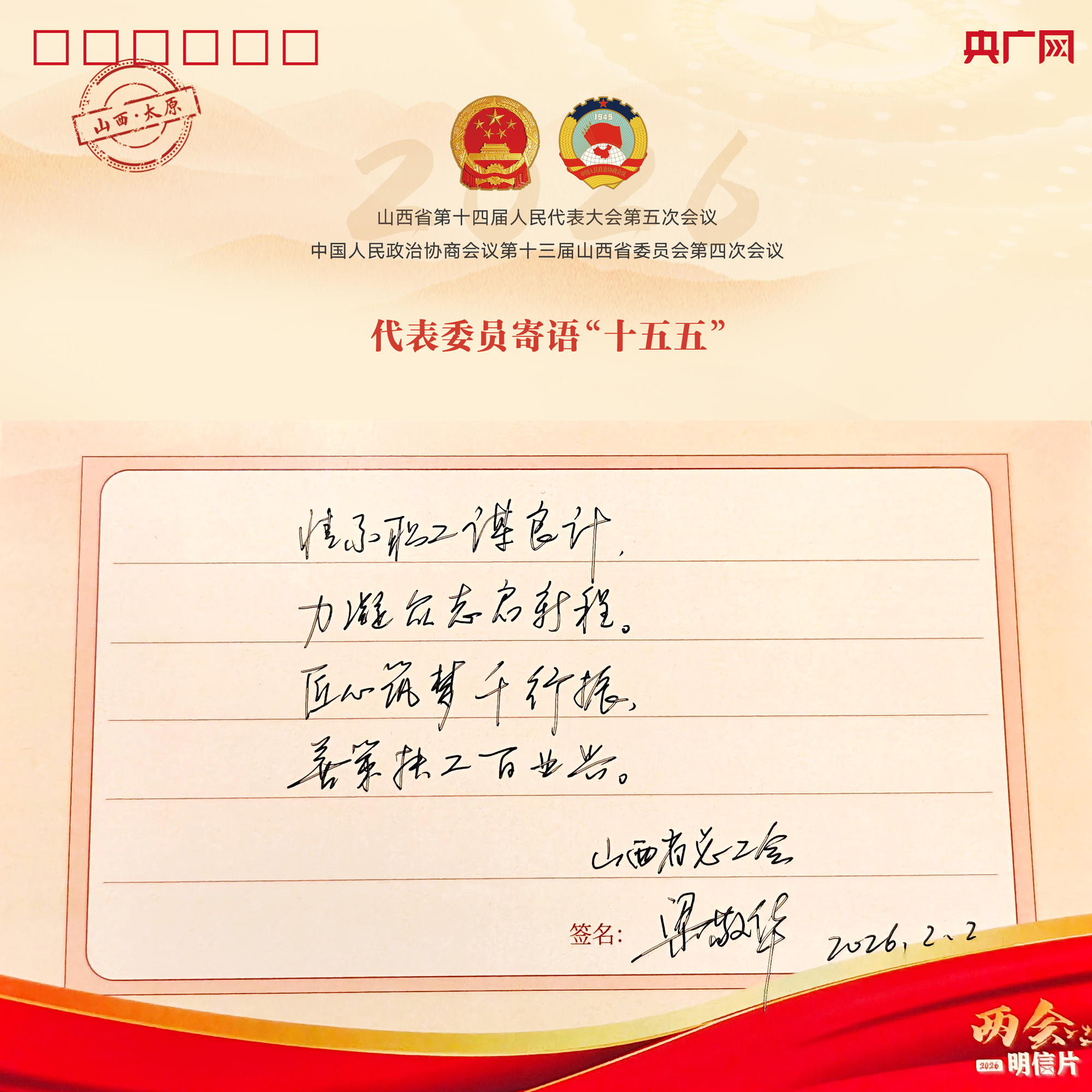 在采访最后,梁敬华代表在明信片上写下了对“十五五”的寄语——情系职工谋良计,力凝众志启新程。匠心筑梦千行振,善策扶工百业兴。