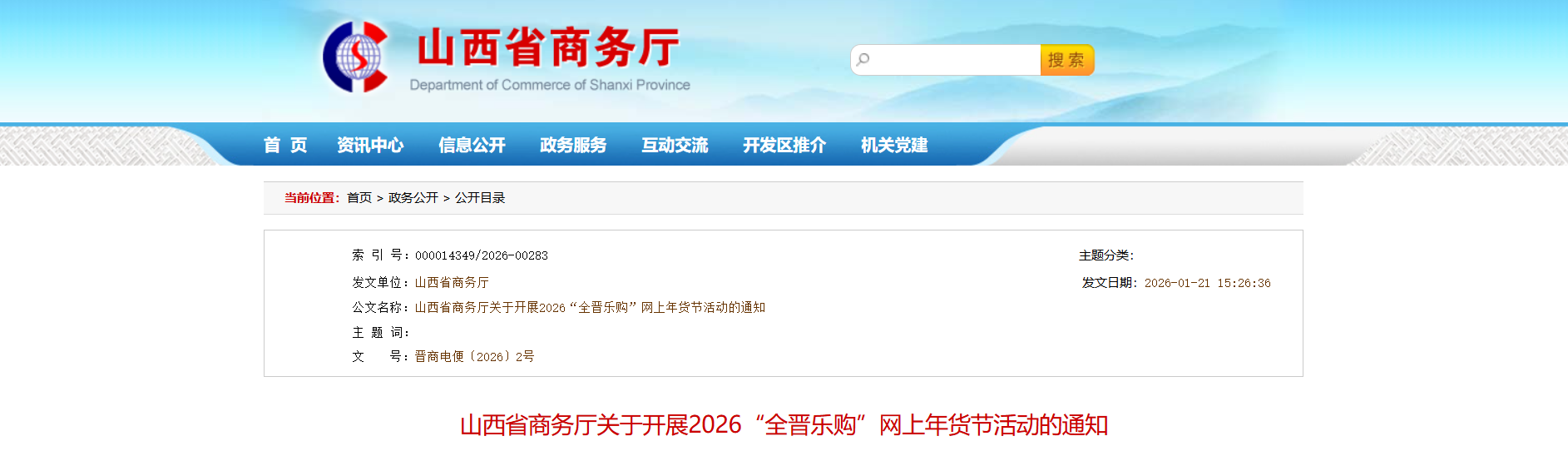 为深入贯彻落实山西省委、省政府关于大力提振消费的决策部署,促进数字经济和实体经济深度融合,山西省商务厅于1月19日至3月4日期间开展2026“全晋乐购”网上年货节活动。活动坚持“政府指导、企业为主、市场化运作”原则,联动省内外多平台、多主体打造线上线下融合的消费盛宴,全力营造欢乐祥和的新春消费氛围。