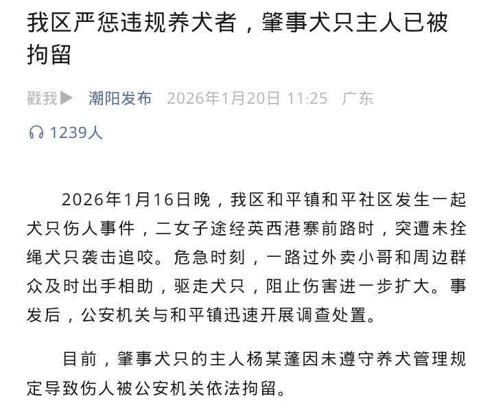 山西晚报·山河+讯 近日,广东省汕头市发生一起犬只伤人事件,引发社会广泛关注。1月20日,据汕头市潮阳区委宣传部官方平台“潮阳发布”通报,涉事犬只主人因违规养犬致人受伤,已被公安机关依法拘留。