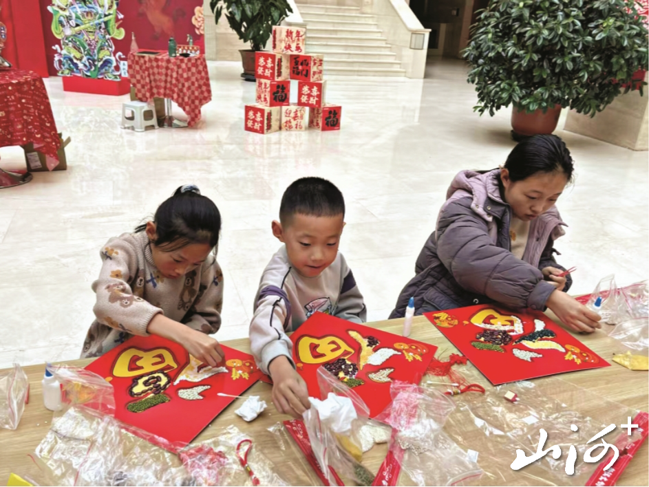 手工体验环节将现场氛围推向高潮,四大手工摊位前很快被兴致勃勃的亲子家庭围得水泄不通。在门神拓印摊位上,孩子们在家长协助下,手持拓包蘸取墨汁,小心翼翼地在雕版上反复轻拍,一幅幅线条清晰、神态威严的门神拓片跃然纸上;五谷杂粮画摊位上,红豆、绿豆、小米等谷物,在亲子家庭的巧手下变成寓意吉祥的“福”字,每一粒谷物都承载着创意与祝福;柿柿如意盆栽区、摊位上,家长与孩子默契配合,修剪扭扭棒、摆放仿真柿子,很快一盆盆造型可爱、寓意“事事如意”的盆栽便大功告成;竹编手工灯笼摊位上,孩子们跟着指导老师学习穿插、编织技巧,不一会儿,一盏盏古朴雅致的灯笼雏形初现,点亮后更添节日氛围感。本次活动的手工项目充分考虑不同年龄段儿童的动手能力,既有适合低龄儿童的简易拓印,也有适合大龄儿童的精细杂粮拼贴,真正实现“全员参与、全程欢乐”。不少家长感慨,平日忙于工作,鲜有机会和孩子一起制作手工艺品,这次活动不仅锻炼了孩子的动手能力,更让亲子情感在协作中不断升温,亲手制作的作品也成了独一无二的新年家居装饰。
