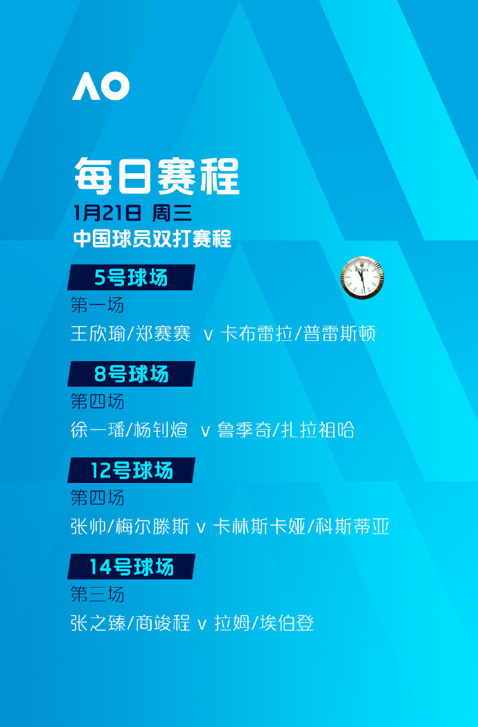 多位中国选手将亮相双打赛场,王欣瑜搭档郑赛赛对阵卡布雷拉/普雷斯顿。