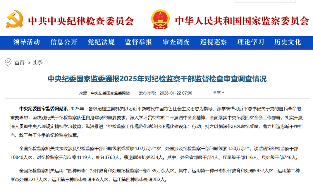 全国纪检监察机关共接收涉及纪检监察干部问题线索或反映4.02万余件次,处置涉及纪检监察干部问题线索3.50万余件,谈话函询纪检监察干部10840人次,对纪检监察干部立案4119人,处分3763人,移送司法机关234人。其中,处分省部级干部4人、厅局级干部116人、县处级干部746人。