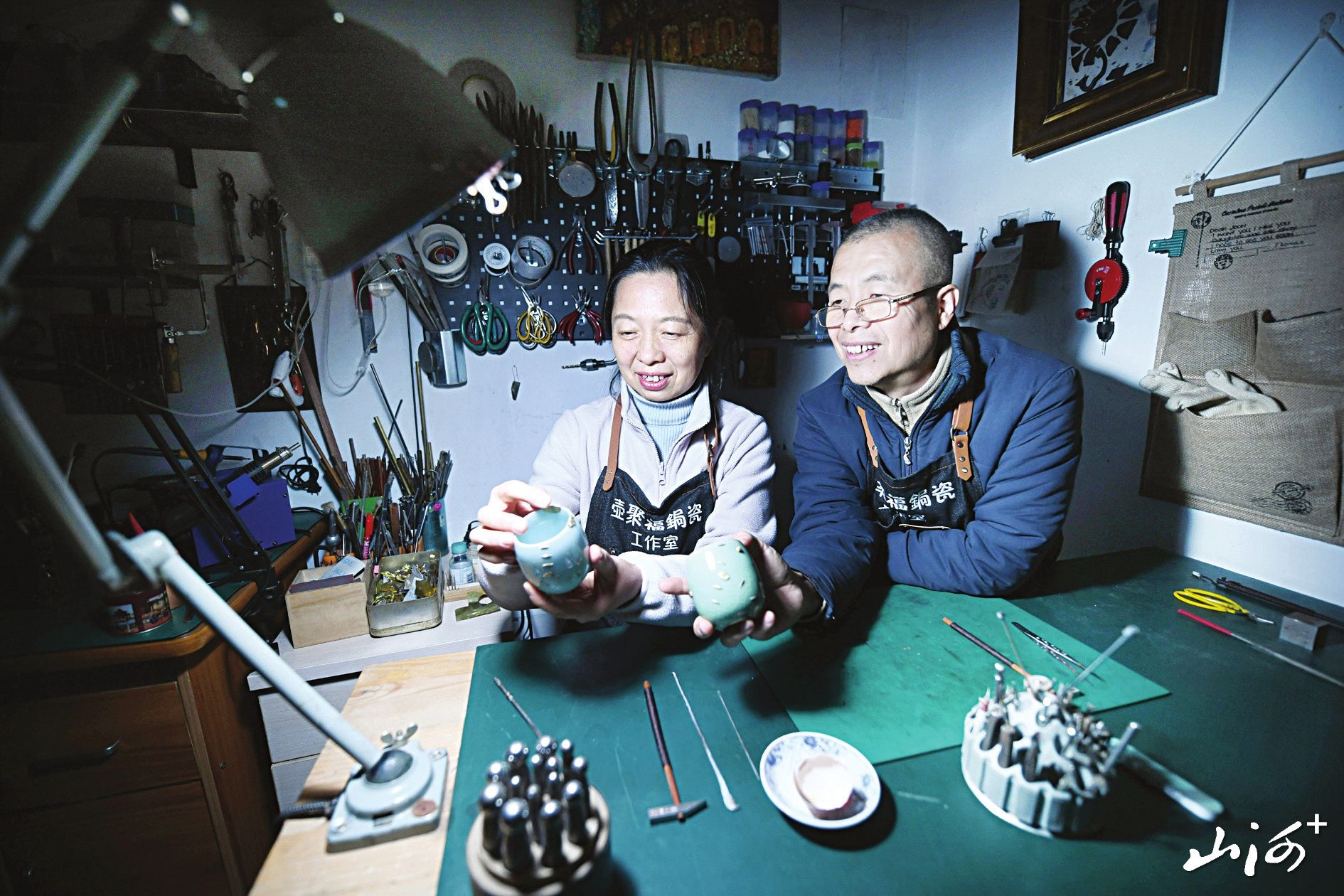 而他的妻子常莉萍,最初是这份执着最坚定的支持者。看着丈夫沉醉于敲打粘补之间,她渐渐从旁观者变成了参与者,最终也投身其中,成为郭智军的徒弟与同行。“他教我技艺,我更理解了他的追求。”常莉萍笑着说。从此,工作台前常能见到夫妻二人并肩而坐、切磋琢磨的身影。在一锤一钉的默契配合中,破损的器物被赋予第二次生命,两人的感情与共同的志向也在此过程中深度融合。