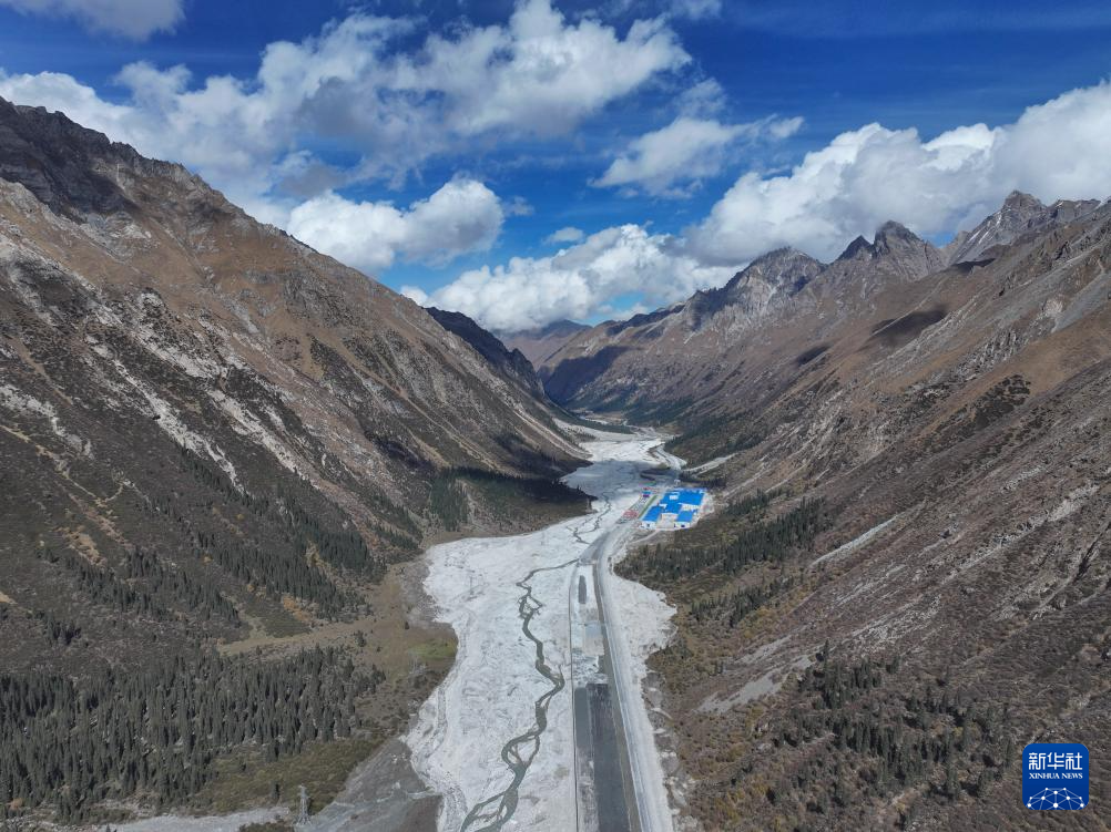 这是10月5日在新疆昭苏县拍摄的昭温公路西天山特长隧道进口端(无人机照片)。从左至右依次为平导洞、左洞、右洞。新华社记者 胡虎虎 摄