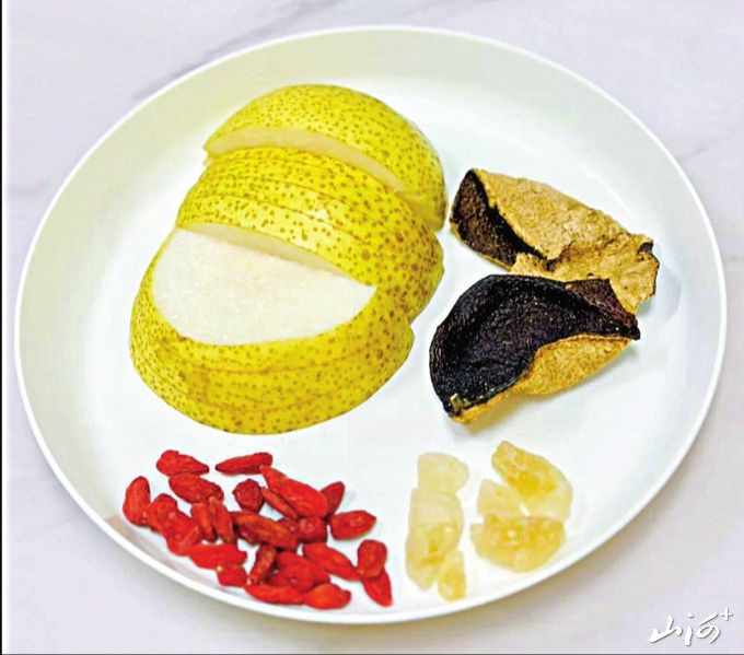 梨洗净,带皮切成大块。陈皮、枸杞泡开,然后在干净的砂锅中倒入清水,加入梨块,再加入陈皮、枸杞,或者可加入莲子、银耳,盖上锅盖,用大火烧开后,根据个人口味加入适量冰糖,再盖上盖,这时候要改用小火煮20分钟。20分钟以后,打开锅盖,用小勺搅拌一下,等冰糖完全化开了,就可以盛入小碗算是做好了。
