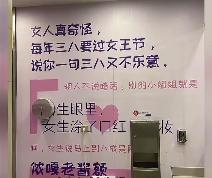 据网友发布的图片显示,涉事海报内容包括:“女人真奇怪,每年三八要过女王节,说你一句三八又不乐意”“小姐姐”“女生涂口红……”“呵,女生说马上到……”等语句。不少网友在评论区指出,此类标语“太过分”“不合时宜”,缺乏对女性的基本尊重。