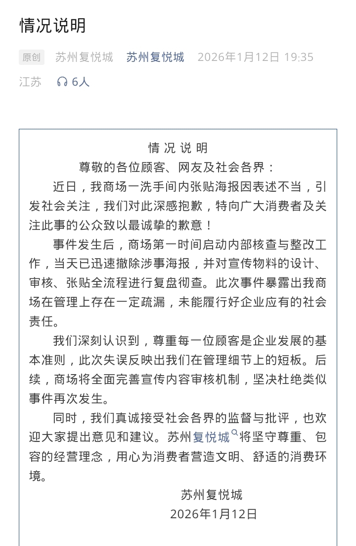 山西晚报·山河+讯 近日,有网友发文反映,苏州复悦城男厕所内张贴了多张与女性相关的宣传海报,内容引发不适。1月13日,山西晚报·山河+记者获悉,苏州复悦城已就此发布情况说明,对事件造成的不良影响深表歉意,并向广大消费者及社会公众致以最诚挚的歉意。