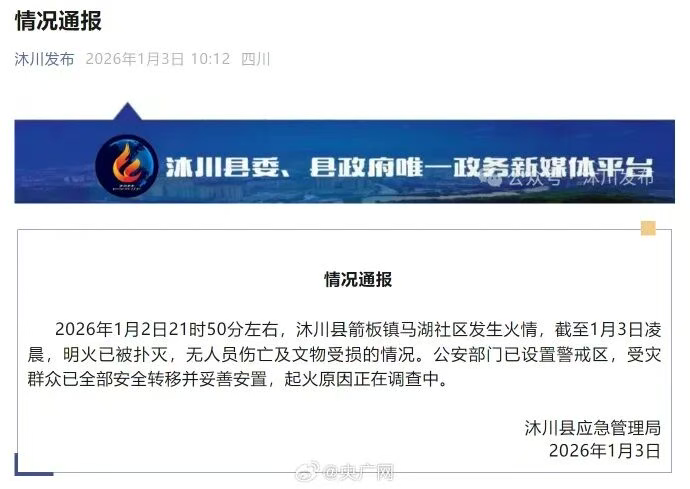 山西晚报·山河+讯 1月2日21时50分左右,四川省乐山市沐川县千年古镇箭板镇马湖社区发生火情。截至1月3日凌晨,明火已被扑灭。据沐川县应急管理局1月4日通报,此次火灾未造成人员伤亡和文物受损,受灾群众已全部安全转移并妥善安置,起火原因正在调查中。