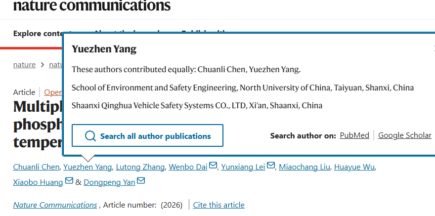 本研究由中北大学与联合培养单位北方特种能源集团陕西庆华汽车安全系统有限公司,以及温州大学、北京师范大学等单位合作完成,是产学研深度融合、协同创新的又一代表性成果。杨月桢同学作为共同第一作者在该顶级期刊上发表论文,充分展现了中北大学博士研究生扎实的学术功底、卓越的创新能力和良好的科研协作精神,也体现了中北大学在高层次人才培养和前沿科学研究方面的显著成效。