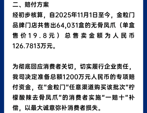 关于赔付方案,经初步核算,自2025年11月1日至今,金粒门品牌门店共售出64031盒的无骨凤爪(单盒售价19.8元),总售卖金额为人民币126.7813万元。公司准备总额1200万元人民币的专项赔付资金,对在“金粒门”任意渠道购买该批次“柠檬酸辣去骨凤爪”的消费者实施“一赔十”补偿。此外,设立食品安全监督热线。