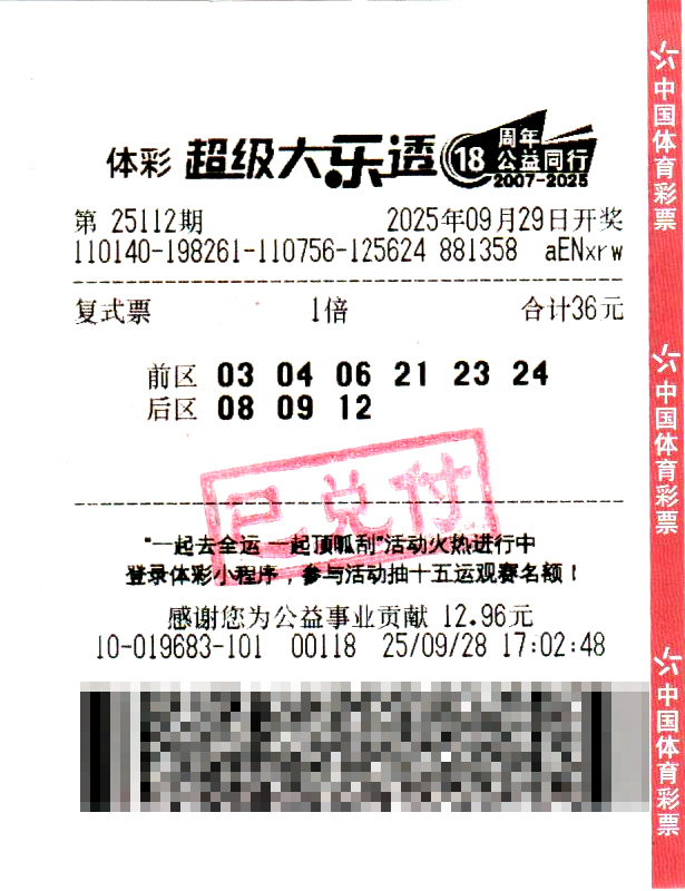 山西晚报·山河+讯 在这个充满收获的金秋时节,中国体育彩票超级大乐透再传捷报!9月29日,中国体育彩票超级大乐透第 25112期开奖号码前区为 03、04、21、23、24,后区为 09、12。当期全国范围内共诞生7注一等奖,山西、天津、江苏、湖北、贵州、陕西各有1注基本投注一等奖入账,福建斩获1注追加投注一等奖。