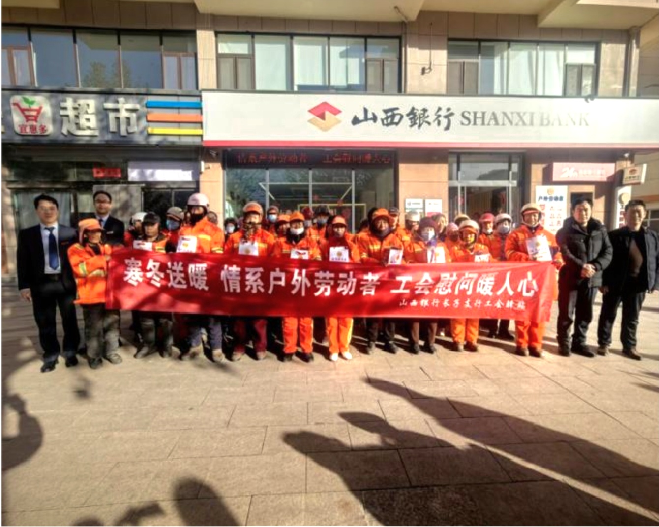 1月15日全国“工会服务户外劳动者日”当天,山西银行长治长子支行工会驿站的工作人员带着“暖冬大礼包”,为像张师傅这样的户外劳动者送上了冬日里的温暖。礼包里不仅有防寒物资,更饱含着山西银行对城市“美容师”们的敬意与关怀。