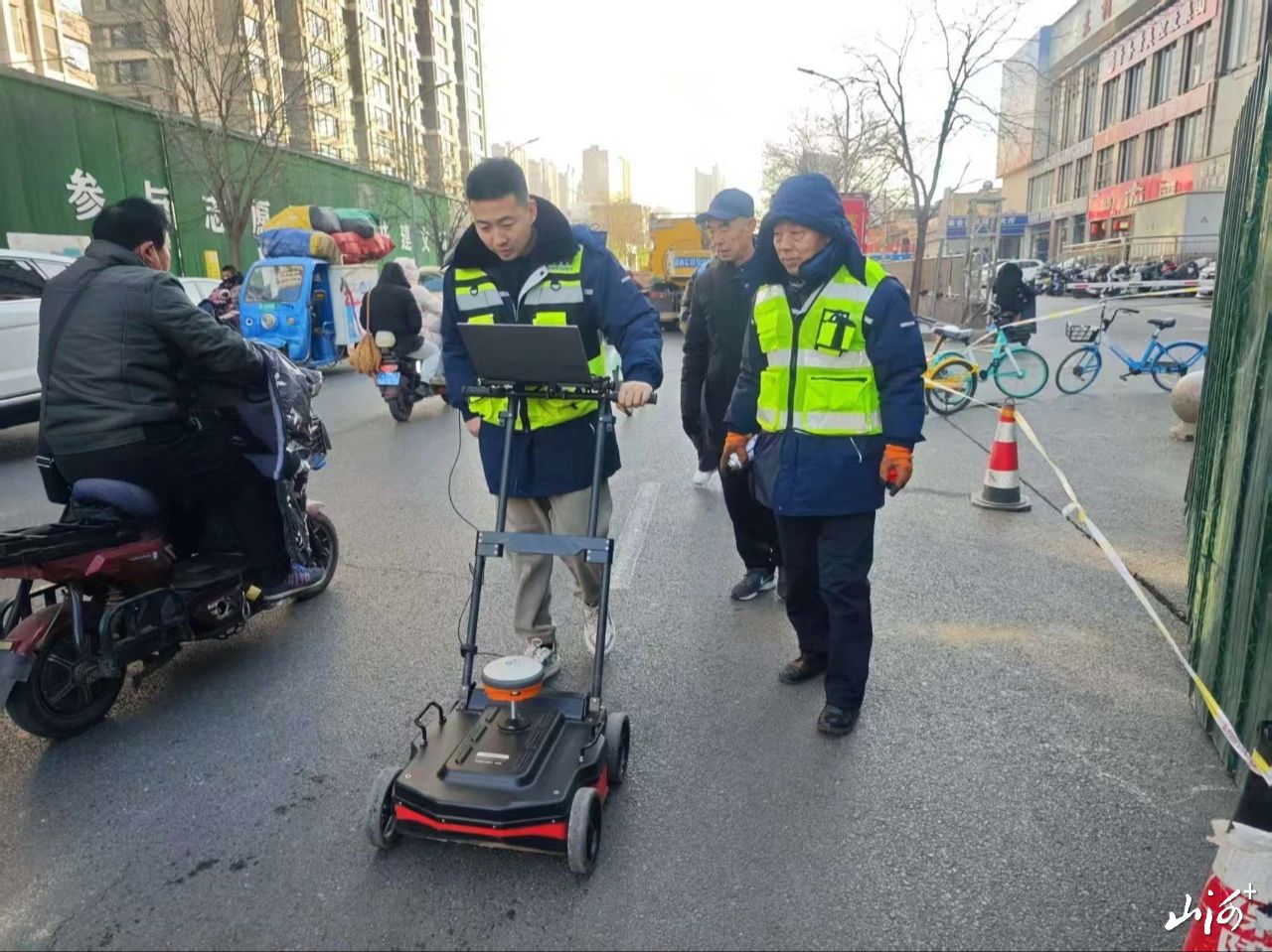 市政部门人员使用专用设备,探测地下空洞。