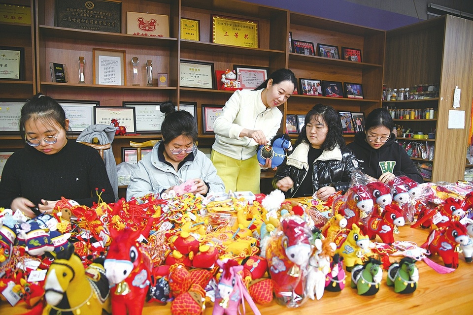 1月2日,山西运城闻喜县省级非遗代表性传承人张静的工作室内,大家正在赶制、销售非遗“马”布艺文创产品。随着春节临近,以马为原型设计的布艺小马文创产品,凭借吉祥美好的寓意受到消费者青睐。