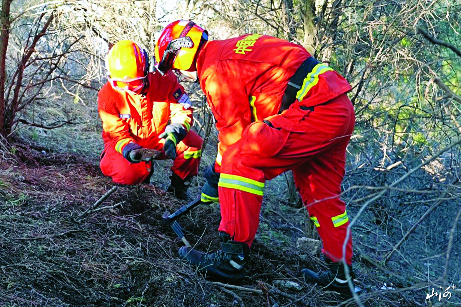 山西机动队伍长治大队指战员在林内重点防火区对腐殖质层厚度与湿度进行检测。范一凡 摄