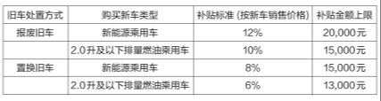 答:补贴金额根据您处置旧车的方式(报废或置换)和购买的新车类型(新能源或燃油)而不同。具体标准如图: