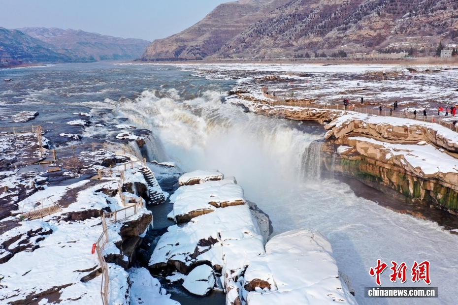 1月1日,游客在山西吉县黄河壶口瀑布景区欣赏雪景。(无人机照片)