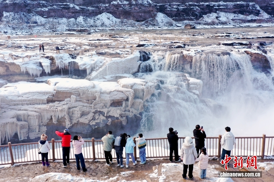 1月1日,游客在山西吉县黄河壶口瀑布景区欣赏雪景。当日,山西吉县黄河壶口瀑布景区雪后初晴。(无人机照片)