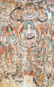 在五台山佛光寺东大殿内,保存着约61.68平方米的珍贵壁画,它是中国现存于木构殿堂建筑中的唯一唐代壁画原作,与唐代建筑、彩塑、题记并称“四绝”。这些绘制于栱眼壁上的《弥陀说法图》等作品,菩萨衣袂飘逸,线条流畅,是窥见大唐艺术气象的窗口。