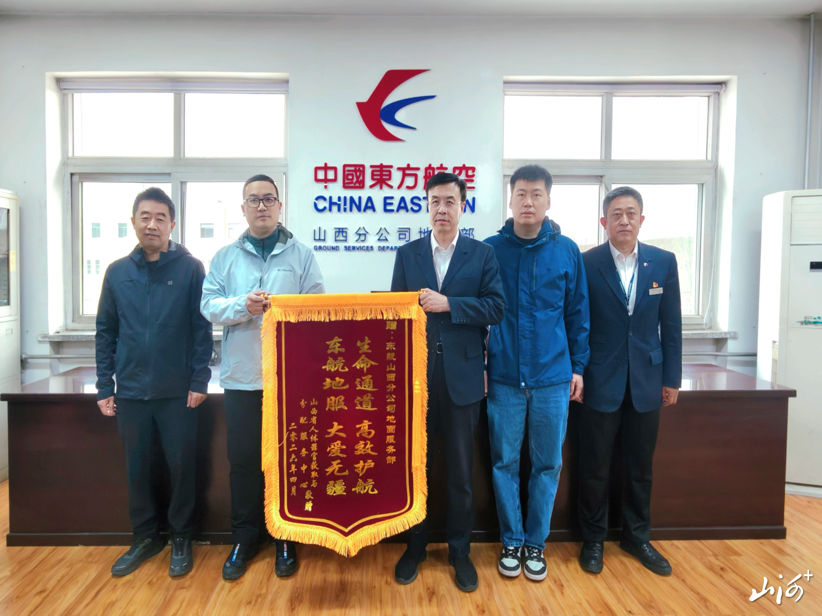 山西晚报·山河+讯 近日,山西省人体器官获取与分配中心专程来到东航山西分公司地面服务部,送上印有“生命通道 高效护航 东航地服 大爱无疆”的锦旗,感谢团队五年如一日,为人体器官航空转运搭建极速绿色通道,用专业与担当守护生命希望。