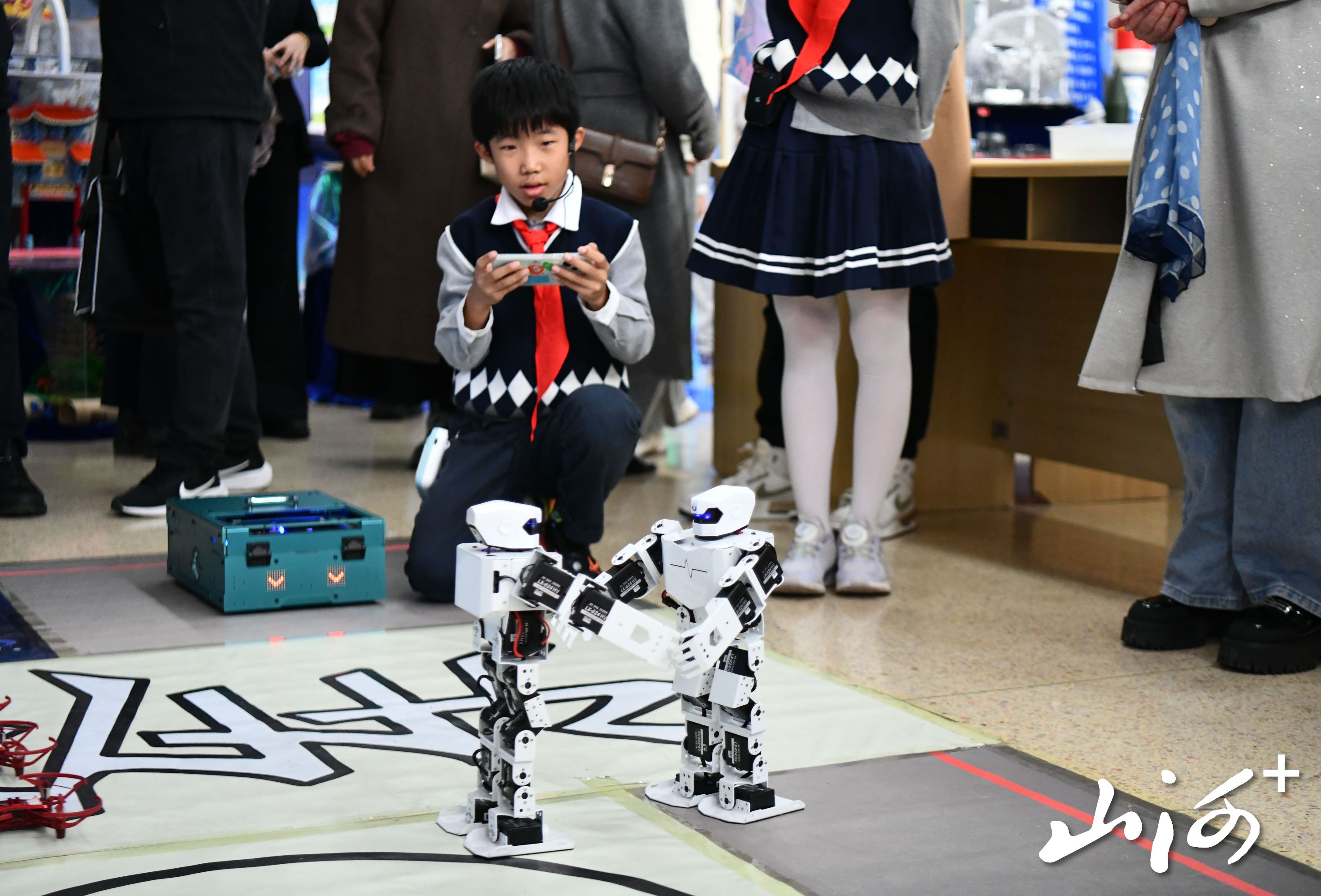 科技游园环节中,校园设置多个展区展示“奇思妙问”活动成果。六楼科技长廊为第一联盟体科创成果核心展示区,悬挂学生原始提问,陈列科技创新小制作、小发明及配套实验报告、小论文;“智能创意乐队”以废旧物品为基础,搭载传感器与编程技术实现指令演奏,融合环保理念与人工智能技术。