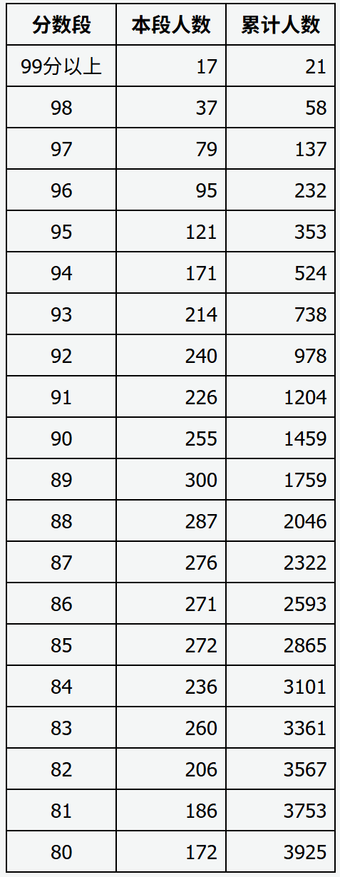 全省报考体育专业考试的考生共有8971名(其中:男生7542名,女生1429名)。考试分四个批次进行,考生分别参加了100 米跑、 800米跑、立定跳远、一分钟杠铃连续挺举四个科目的考试。单科分值均为25分,总分100分。
